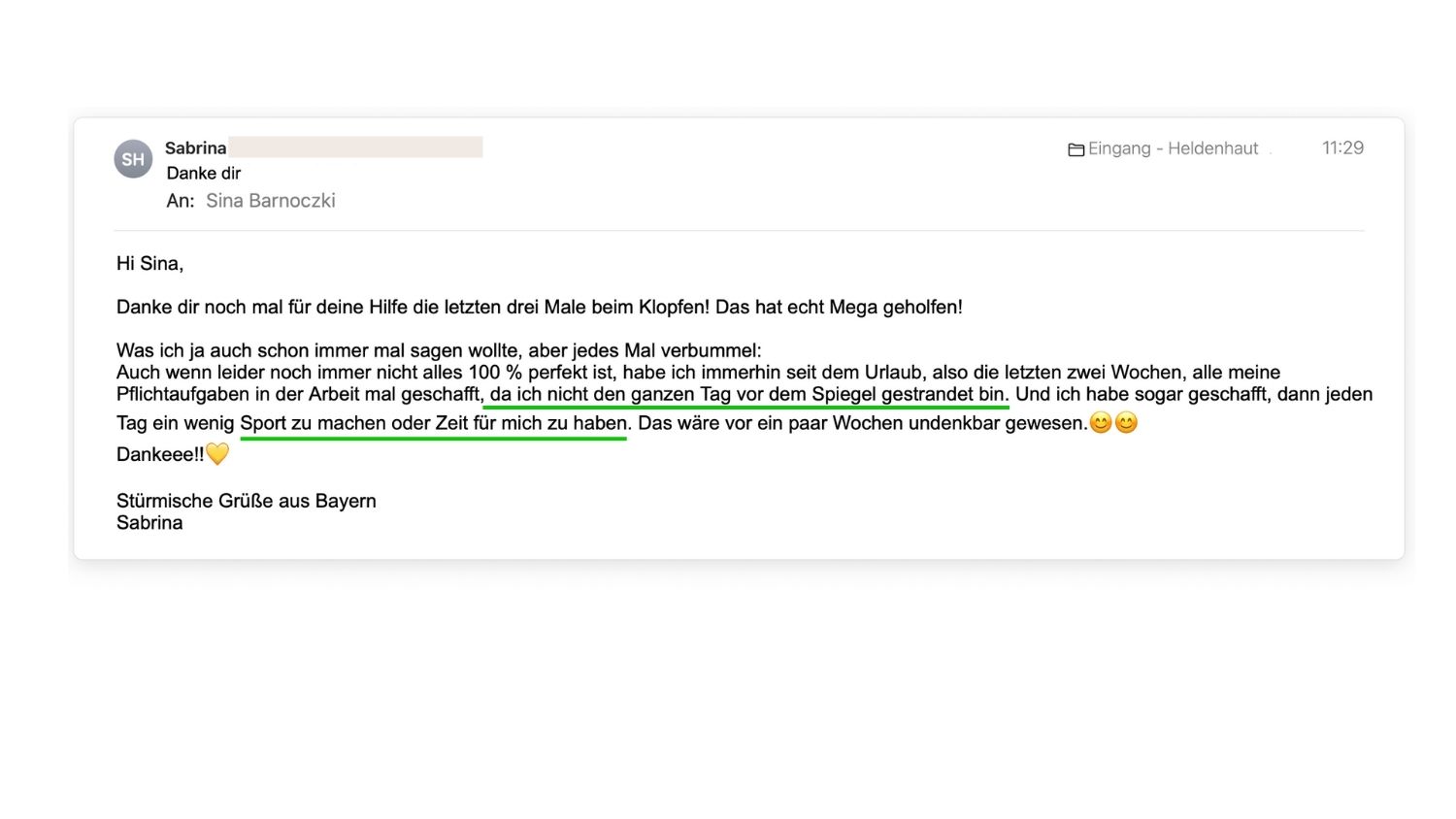 „Ich habe gute Fortschritte gemacht und einfach ‘die Lust an Skinpicking’ verloren. Die Haut ist richtig gut und selbst wenn ich nur selten klopfe, hat es mir richtig viel gebracht. Vielen Dank dafür!! Bewertung kommt noch.“